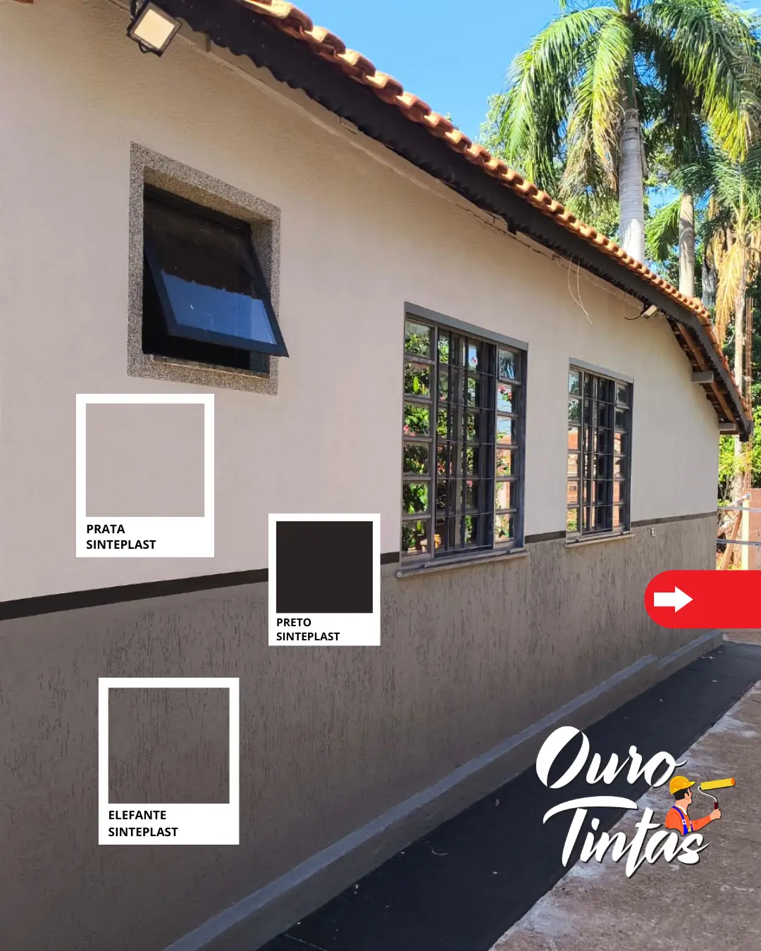 Neste projeto, o pintor Sinval aplicou a tinta da Sinteplast emborrachada externamente e interna/externa fez a aplicação da textura rustica Oasis da World Color